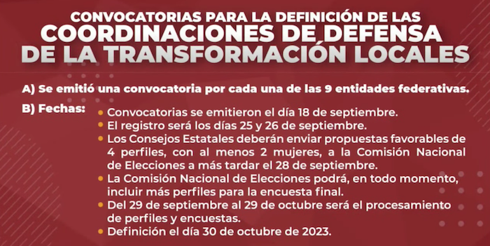 Durante las primeras horas de este martes, Morena detalló las convocatorias para el proceso interno de la designación de los candidatos de las nueve gubernaturas que contenderán en las elecciones del 2024.