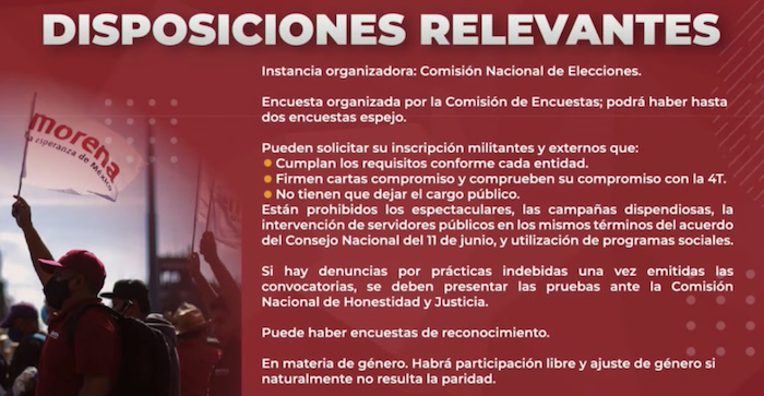 En cuanto a la sexta base de la convocatoria, en la que se establece que "queda prohibido el uso de campañas y anuncios espectaculares, uso de recursos públicos de cualquier naturaleza, intervención de servidores públicos en favor o en contra de los participantes", el dirigente explicó que la Comisión de Elecciones será la encargada de valorar si hay cumplimiento o no de la misma.