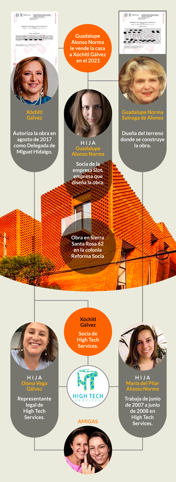 Xóchitl Gálvez Ruiz compró en 2021 una de las cinco casas de un proyecto inmobiliario que ella autorizó como Delegada de Miguel Hidalgo, y que se desarrolló en una propiedad de la señora Guadalupe Norma Suinaga de Alonso, cuya hija María del Pilar Alonso es amiga de Diana Vega Gálvez, hija de la Senadora, y exempleada de una de sus empresas.