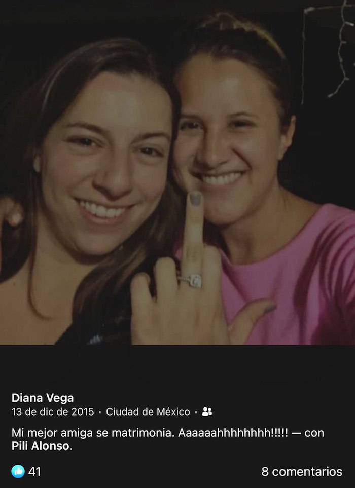 Casi dos años antes, el 13 de diciembre de 2015, Diana Vega Gálvez publicó en su cuenta de Facebook un mensaje junto a la fotografía de ella con “Pilli” Alonso Norma, quien mostraba en el dedo medio un anillo: “Mi mejor amiga se matrimonia (sic)”.
