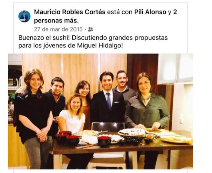 “Buenazo el sushi. Discutiendo grandes propuestas para los jóvenes de Miguel Hidalgo”, escribió en su cuenta de Facebook el panista Mauricio Robles Cortés, el 27 de marzo de 2015, junto a una fotografía en la que aparece “Pili” Alonso Norma, junto a Gálvez, quien le compró a su madre la casa que ella como delegada autorizó construir y que le costó cinco millones de pesos menos.