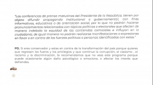 Pero, además, el Presidente añadirá su propio mensaje: "PD. Si eres conservador y estás en contra de la transformación del país, porque quieres que regresen los fueros y los privilegios de unos cuantos, y que continúe la corrupción, el clasismo, el racismo y la discriminación, te recomendamos que no veas este programa, porque puede ocasionarte algún daño psicológico o emocional, o afectar los interés que defiendes". Asimismo, añadirá la firma de "AMLO", las iniciales del Presidente, a su mensaje, para evitar usar su cargo y más sanciones electorales.