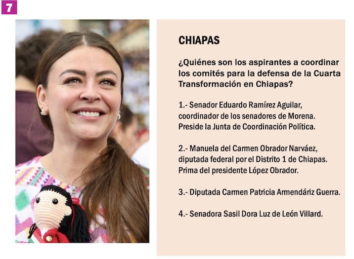 En Chiapas, por el contrario, se perfilan en la contienda tres mujeres y un varón. Manuela del Carmen Obrador Narváez, Diputada federal por el Distrito 1 de Chiapas, prima del Presidente López Obrador; la Diputada Carmen Patricia Armendáriz Guerra y la Senadora Sasil Dora Luz de León Villard. En precandidato varón es el senador Eduardo Ramírez Aguilar, coordinador de los senadores de Morena y presidente de la Junta de Coordinación Política en la Cámara Alta.