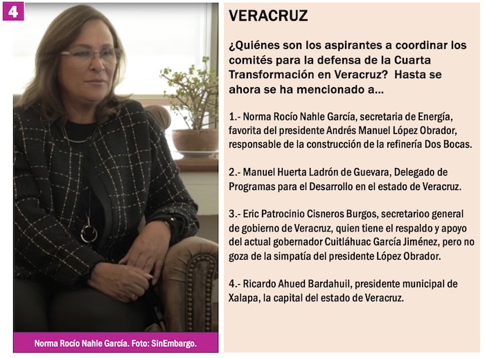 En Veracruz están perfilados tres aspirantes varones y una mujer, pero con la desventaja para los señores que la potencial precandidata es nada menos que Norma Rocío Nahle García, Secretaria de Energía, responsable de la construcción de la Refinería Dos Bocas y favorita del Presidente Andrés Manuel López Obrador.