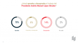Ciudad de México, 23 de julio (SinEmbargo).– El nivel de aprobación para el Presidente de México, Andrés Manuel López Obrador es del 78 por ciento a unos días de cumplir su quinto año de Gobierno, de acuerdo con una encuesta divulgada este domingo.