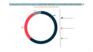 Luego, De las Heras Demotecnia pregunta: En general, ¿usted cree que la situación del país va en la dirección correcta? El 62 por ciento consideró que sí; el 30 por ciento aseguró que va en la vía incorrecta y el ocho por ciento no sabe.