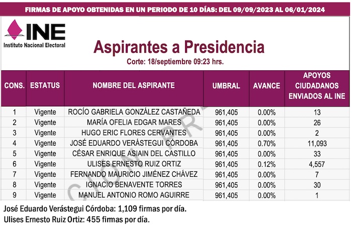 Hay nueve ciudadanos que aspiran a contender por Presidencia por la vía independiente quienes ya fueron autorizados por el INE para conseguir las 961 mil 405 firmas de apoyo que necesitan, en un periodo que terminará la primera y segunda semanas de enero del 2024.