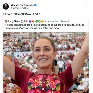 Ciudad de México, 25 de septiembre (SinEmbargo).- Vicente Fox Quesada lanzó esta tarde un nuevo mensaje antisemita en contra de Claudia Sheinbaum Pardo, Coordinadora de la Defensa de la Trasformación y virtual candidata a la Presidencia de México por parte de la alianza que conforman los partidos Morena, del Trabajo (PT) Y Verde Ecologista de México (PVEM).