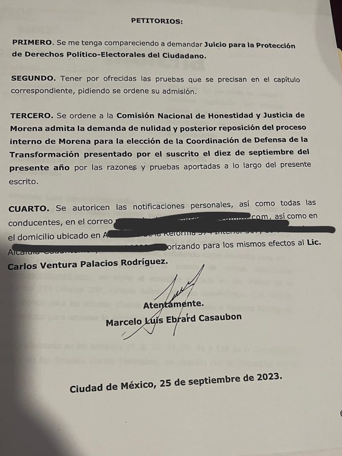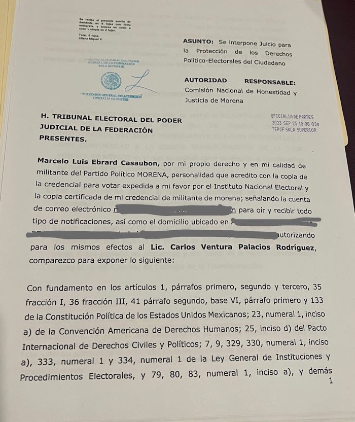 Ciudad de México, 26 de septiembre (SinEmbargo).– Marcelo Ebrard Casaubón presentó un juicio para la protección de sus derechos políticos-electorales ante el Tribunal Electoral del Poder Judicial de la Federación (TEPJF) una vez que ha transcurrido el plazo de 10 días sin que la Comisión de Honestidad y Justicia de Morena le haya informado si procede o no su demanda para reponer el proceso en el cual resultó electa Claudia Sheinbaum Pardo como Coordinadora Nacional de los Comités de Defensa de la Cuarta Transformación, como se le denomina a la virtual candidata presidencial.