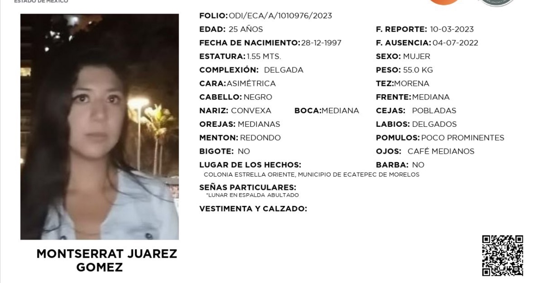 De acuerdo con la Fiscalía, Montserrat Juárez había sido reportada como desaparecida ante las autoridades del Estado de México en julio del año pasado. Como parte de las indagatorias, dicha institución busca determinar si hay alguna actuación delictiva por parte de policías y paramédicos vinculados al caso.