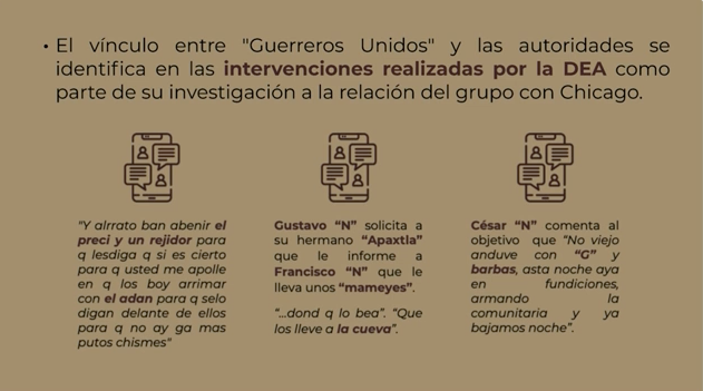 Encinas también reconoció que el grupo criminal Guerreros Unidos, principal señalado por la desaparición de los 43 según la verdad histórica, operaba en el estado de Guerrero con vínculos con las corporaciones responsables de la seguridad pública y el combate al narcotráfico en la región, como incluso la DEA pudo corroborar por medio de intervenciones de vías de comunicación que realizó la agencia estadounidense.