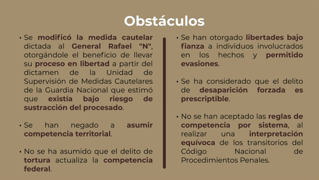 El subsecretario destacó la prevalencia de la “interpretación discrecional” de los jueces y la dispersión de las carpetas de investigación de tal manera que son tratados en diferentes juzgados, lo cual ha dificultado la judicialización y acceso a la justicia en el caso.