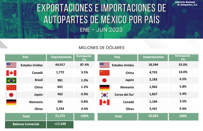 Dentro del sector automotriz, apenas recuperándose por la crisis de los semiconductores por la pospandemia, las autopartes son la joya de la corona. El 87 por ciento de las autopartes (transmisores, frenos, carrocería, motores, enfriamiento...) que se exportan van a las plantas de ensamble de Estados Unidos y el resto a Canadá (3.5 por ciento), Brasil (1.9 por ciento), China (1.2 por ciento), entre otros mercados como Japón y Alemania.