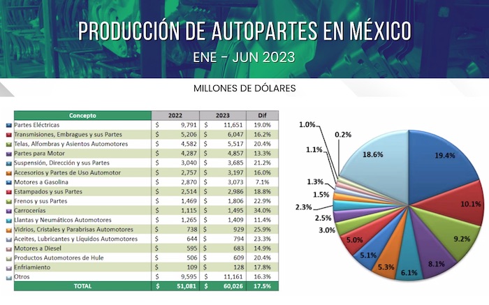 Conforme siga la huelga de trabajadores del sector automotriz en EU, nuestro principal comprador de autopartes, se irán acumulando pérdidas millonarias, aunque no tan significativas respecto al total de exportaciones por 44 mil millones de dólares en la primera mitad de 2023. Los empleos directos aún no están en riesgo, pero el panorama cambiará si el paro se extiende más semanas. Así lo informó la industria.