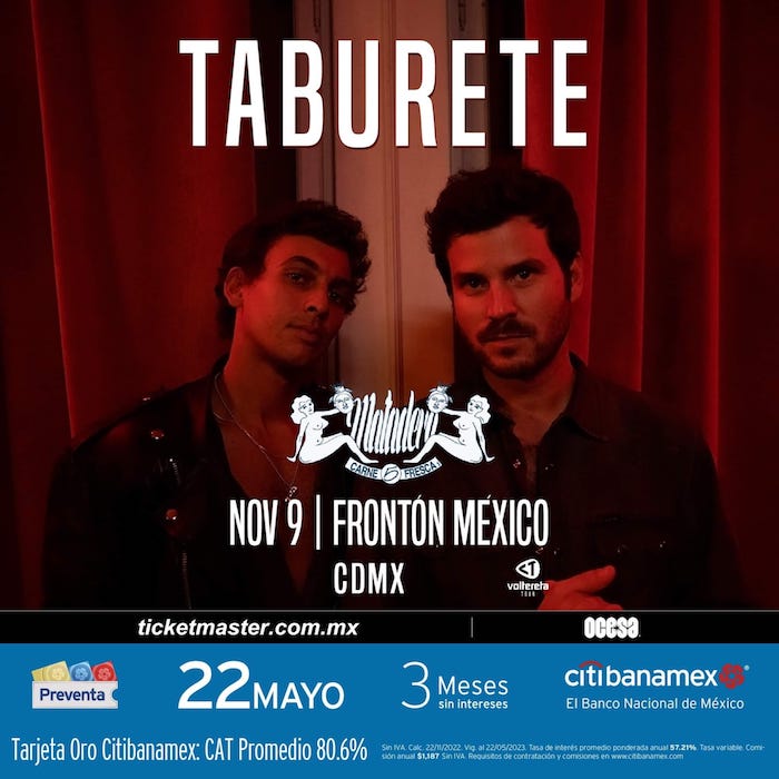 Los boletos para el show de Taburete en el Frontón México se encuentran a la venta a través del sistema Ticketmaster y el costo de los tickets es de 960 pesos más cargos.