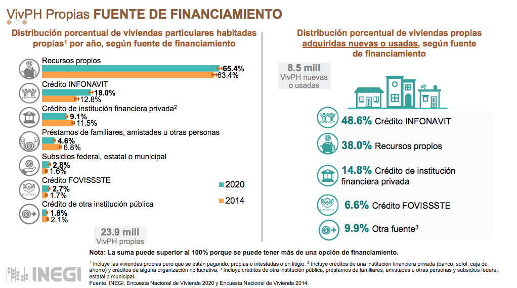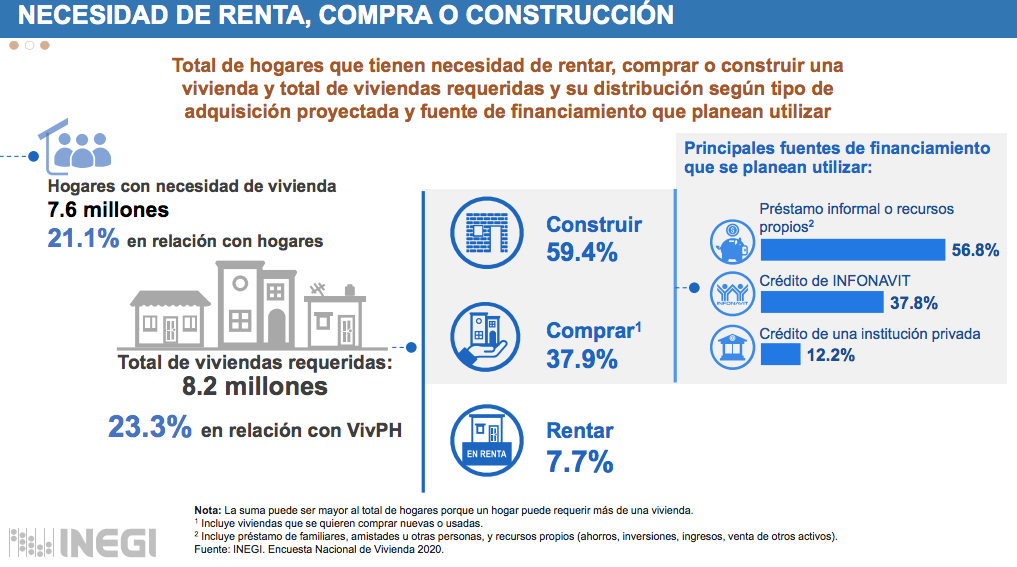 Ciudad de México, 2 de octubre (SinEmbargo).– De acuerdo con datos de la Encuesta Nacional de Vivienda 2020 del Inegi, en México hay 35.3 millones de viviendas, de las cuales, el 57.1 por ciento es propia, 16.4 por ciento es rentada, 14.2 por ciento es prestada, 10.7 por ciento es una vivienda propia por pagar y el 1.6 por ciento se encuentra en otra situación, por lo que entidades bancarias privadas y el Gobierno federal han ampliado la gama de créditos inmobiliarios para que más mexicanos adquieran una vivienda.