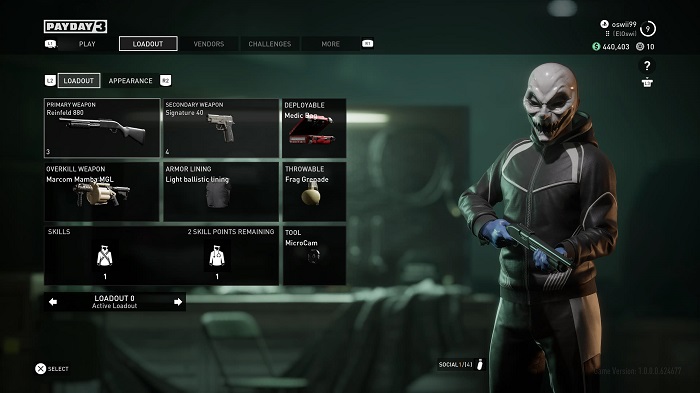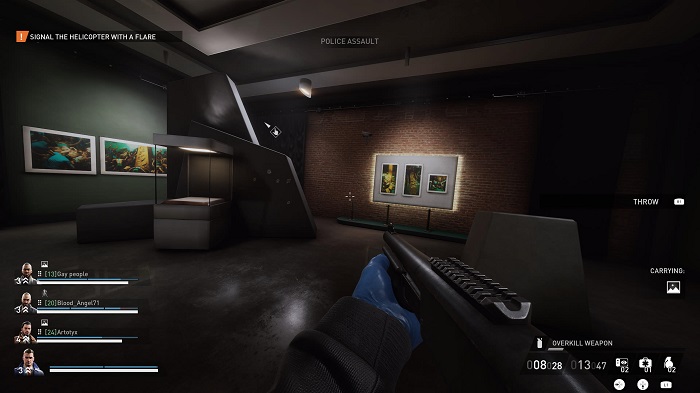 A nivel jugabilidad, siendo un juego enfocado por completo en crear una experiencia cooperativa ya sea en línea con otras personas o en ocasiones con la ayuda de ciertos personajes controlados por la computadora del juego, la comunicación es necesaria, sin embargo, gracias al sistema de “ping” que tiene el juego, esto también puede ser no tan necesario, además de que durante cada atraco, las instrucciones de objetivos o tareas por hacer son muy claras dentro del mapa y la pantalla. Dicho esto, el juego nos pone en el papel de un miembro de este equipo el cual podremos personalizar de una manera un poco general en el tipo de máscara que utilizamos, las vestimenta general y guantes, también en el armamento que podemos cargar, las diferentes armas, granadas, equipamiento especial como curación o escudos, así como un arma especial que podremos solicitar en cierto momento de la partida y que es más poderosa que las demás.