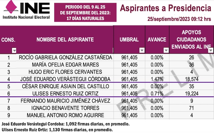 En el proceso de recolección de firmas para los aspirantes independientes a la Presidencia de la República, luego de 17 días, el exgobernador priista de Oaxaca, Ulises Ernesto Ruiz Ortiz, ya supera al actor de derecha José Eduardo Verástegui Córdoba por el número de firmas presentadas ante el INE. Sin embargo, hasta el momento, a Verástegui le han sido validadas más firmas por el INE.