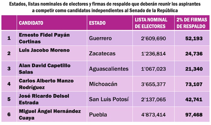 Ernesto Fidel Payán Cortinas de Guerrero; Luis Jacobo Moreno de Zacatecas; Alan David Capetillo Salas de Aguascalientes; Carlos Alberto Manzo Rodriguez de Michoacán; José Ricardo Deisol Estrada de San Luis Potosí y Miguel Ángel Hernández Cuaya de Puebla son los seis independientes que aspiran por un escaño en el Senado.