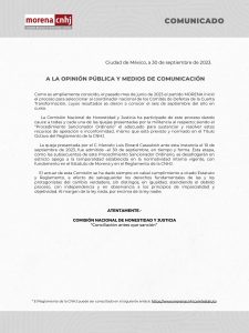 "Esta etapa, como las subsecuentes de este Procedimiento Sancionador Ordinario, se desahogarán en estricto apego a la temporalidad establecida en la normatividad interna vigente, con fundamento en el Estatuto de Morena y en el Reglamento de la CNHJ. El actuar de esta Comisión se ha dado siempre en cabal cumplimiento a citado Estatuto y Reglamento, a efecto de salvaguardar los derechos fundamentales de las y los protagonistas del cambio verdadero, sin distingos, en igualdad, atendiendo el debido proceso, con independencia y en observancia a los principios de imparcialidad y objetividad. Al margen de la ley nada, por encima de la ley nadie", añadieron.