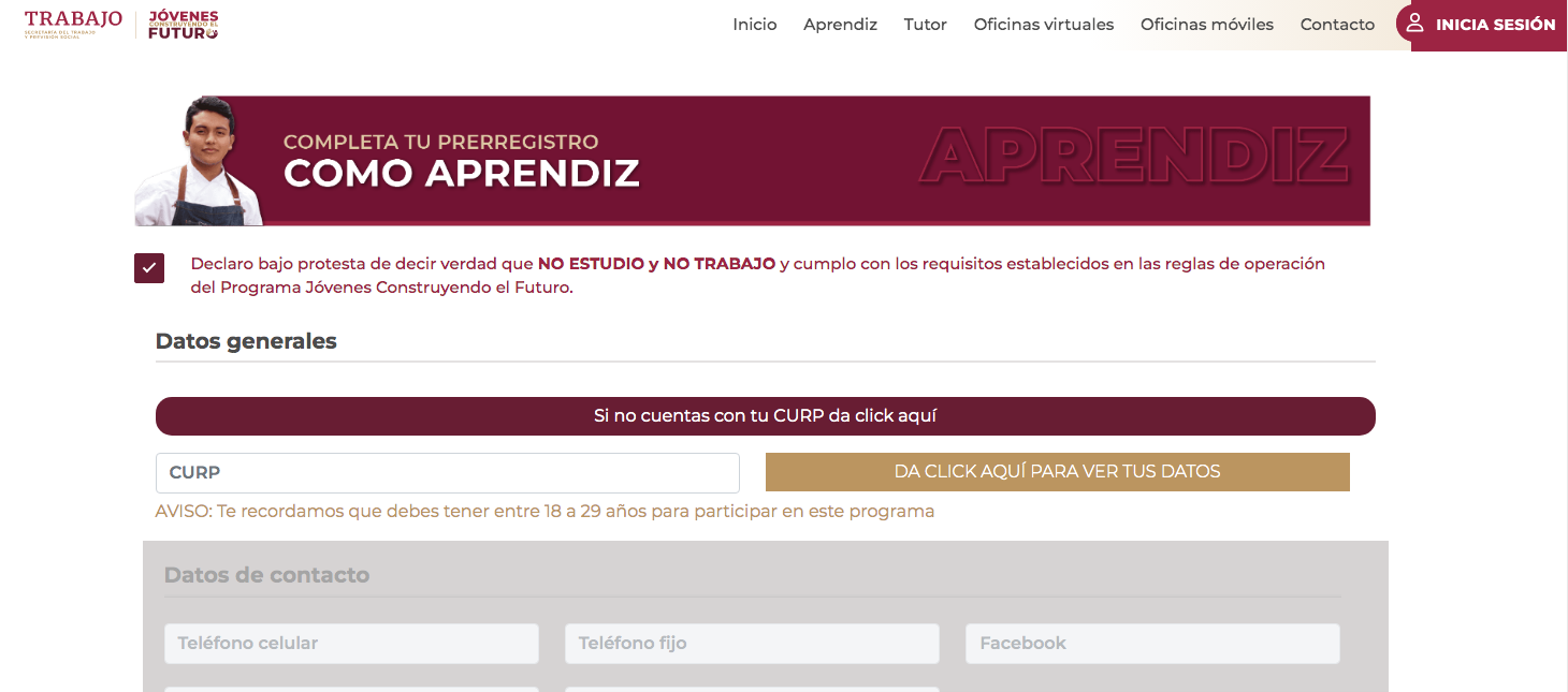 El registro al programa "Jóvenes Construyendo el Futuro" se realiza en línea a través de la página https://jovenesconstruyendoelfuturo.stps.gob.mx. Una vez que ingresaste, debes dar click en la opción “Regístrate como aprendiz” y luego “Registro en línea” para llenar el formulario.