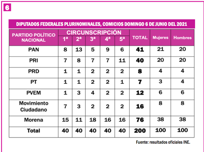 A continuación se muestra la lista con el número de diputados plurinominales en la elección de 2021.