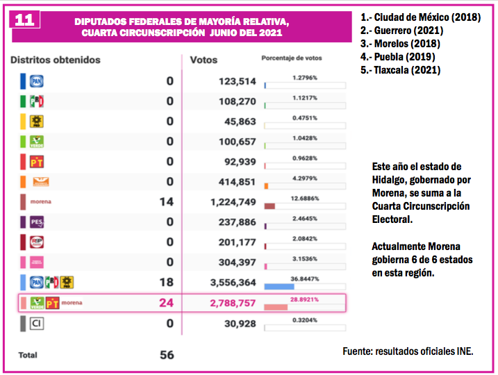 Después de la elección de 2021, Morena gana tres gubernaturas, le quita San Luis Potosí y Zacatecas al PRI y Tamaulipas al PAN. Además, el estado de Querétaro que hacía una tercia muy fuerte con Aguascalientes y Guanajuato, para las elecciones de 2024 va a estar incluido en la quinta circunscripción, esto significa que el panorama cambia radicalmente y la cuota de diputaciones puede aumentar para Morena y el PAN va a perder mucha fuerza porque se queda solo con dos gubernaturas.