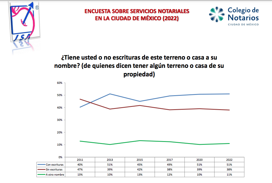 En la Ciudad de México, en el año 2022, el 51 por ciento de las personas decía contar con escrituras de su vivienda, el 38 por ciento no tenía este documento y el 11 por ciento afirmaba tener una propiedad a nombre de otra persona, de acuerdo con los resultados de la Novena Encuesta de Servicios Notariales de la Ciudad de México.
