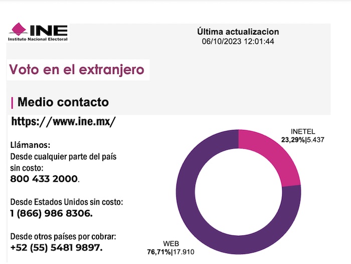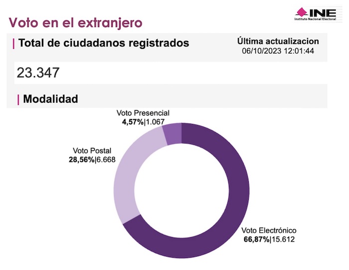 Ciudad de México, 6 de octubre (SinEmbargo).- Un total de 23 mil 347 ciudadanos mexicanos, residentes en el extranjero, se han registrado hasta el momento para votar en los comicios del domingo 2 de junio del 2024, informó este día el Instituto Nacional Electoral (INE) en su plataforma digital.