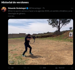 El ultraderechista subió un video donde dispara un rifle de asalto, acompañado con un mensaje amenazante en contra de "los terroristas" que apoyan la agenda 2030, el cambio climático y la "ideología de género".