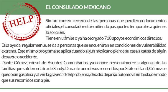 Dicen que después de la tormenta viene la calma, pero para Hortensia ha sido todo lo contrario. Ella trabaja como líder comunitaria en “el centro del inmigrante”. Esta asociación sin fines de lucro está ayudando a las personas que fueron victimas de Sandy. La asistencia que ofrece es diversa. En las primeras horas del desastre, llevaron alimentos enlatados, vestimenta y agua. La asociación también está brindando asesoría legal para las personas con problemas para recuperar los depósitos de las viviendas que rentaban y están ayudando a las personas a llenar las solicitudes para aplicar a los beneficios tanto del gobierno norteamericano como del mexicano.