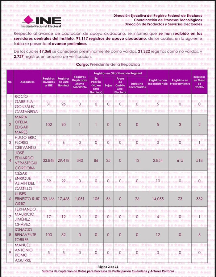 No sólo eso: Casi el 10 por ciento de las firmas recabadas por Verástegui registran “inconsistencias”, un total de 2 mil 857, y hasta presentó 340 duplicadas, según la información oficial del Instituto Nacional Electoral (INE) al corte de este jueves 12.