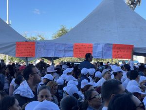 Las maestras y maestros tomaron un tramo de la avenida Tecnológico, entre Pedro Rosales de León y la avenida de la Raza, donde montaron cinco carpas blancas sobre los carriles vehiculares con circulación de sur a norte y una tarima frente a la entrada principal del edificio de los juzgados federales, que continuaron sus operaciones.