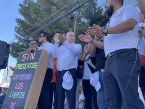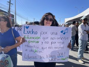 “Los maestros luchando también están educando”, gritaban al unísono los docentes que en cartulinas o pancartas compartían mensajes como: “los libros en bodegas no sirve”, “exigimos el derecho de tener libros gratuitos”, “Maru Campos entrega los libros de texto”.