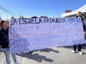 “Se hace un llamado a la Lic. María Eugenia Campos Galván: queremos libros para nuestros hijos, con la educación no se juega”, se leía en la pancarta que la madre de familia sostenía durante el plantón.