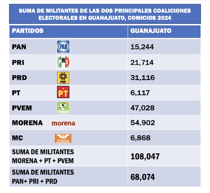 Lo mismo sucede cuando se suman los afiliados que el Partido del Trabajo y el Partido Verde Ecologista tienen en Guanajuato, pues llegan a 108 mil 47 militantes activos, contra 68 mil 74 que tiene la coalición PAN, PRI, PRD.
