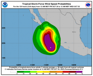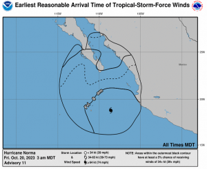 Se pronostica que "Norma" se debilite a partir del viernes y durante el fin de semana a medida que se acerque a tierra firme. Aún no estaba claro si tocará tierra cerca de Los Cabos —una zona que comprende los balnearios de San José del Cabo y Cabo San Lucas—, o virará antes y se enfilará hacia la costa de Sinaloa, más al este.