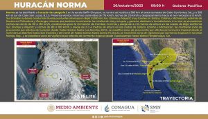 A través de una videoconferencia de prensa, en la que participaron la Comisión Nacional del Agua (Conagua), la Secretaría de Marina (Semar), la Coordinación Nacional de Protección Civil (CNPC) y el Servicio Meteorológico Nacional (SMN), se explicó que durante la tarde de hoy, el centro del huracán "Norma", categoría 4 y con vientos de 209 a 251 kilómetros por hora (km/h), se ubicará aproximadamente a 330 kilómetros (km) al suroeste de las costas de Jalisco y a 600 km al sur de Cabo San Lucas, Baja California Sur, con dirección hacia Baja California Sur.