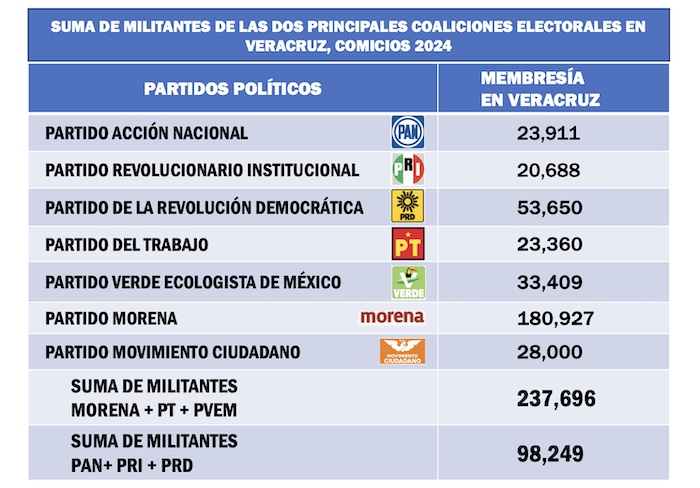 En Veracruz, entidad gobernada actualmente por el morenista Cuitláhuac García Jiménez, Morena tiene registrados ante el Instituto Nacional Electoral (INE) 180 mil 927 militantes, contra 23 mil 911 del PAN y otros 20 mil 688 del Partido Revolucionario Institucional (PRI). Al Partido de la Revolución Democrática (PRD) todavía le queda una buena reserva de 53 mil 650 militantes, y juntos los tres partidos del Frente Amplio por México llegan a 98 mil 249 afiliados. Sin embargo, enfrente, la suma de afiliados a los padrones estatales de Morena, Partido del Trabajo y Partido Verde, llega a 237 mil 696 ciudadanos.