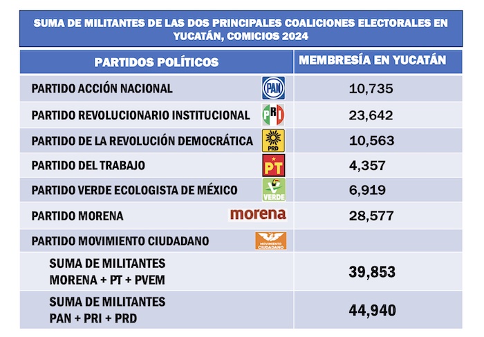 El caso de Yucatán es muy diferente, pues las dos estructuras de los padrones de las coaliciones que encabezarían Morena y el PAN, tienen fuerzas muy equilibradas en la entidad. Entre Morena y sus aliados del PT y el Partido Verde suman 39 mil 853 afiliados, peros sus rivales PAN-PRI-PRD tienen registrados, en la suma de sus padrones de militantes, 44 mil 940 ciudadanos. Lo que podría inclinar la balanza en favor de Morena y sus aliados es la reciente incorporación, a las filas del Partido Verde, del exsenador priista Jorge Carlos Ramírez Marín.