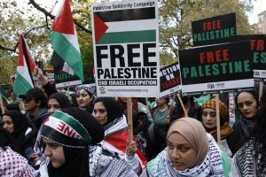 Ondeando banderas palestinas, los reunidos gritaban “dejen de bombardear Gaza” y reclamaron que se ponga fin al bloqueo y los ataques aéreos con los que Israel respondió a una incursión brutal en el sur, de la milicia Hamás que controla la Franja.