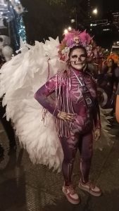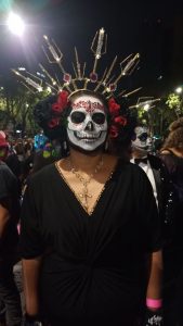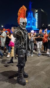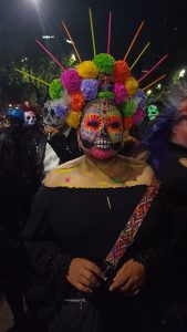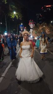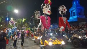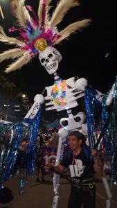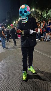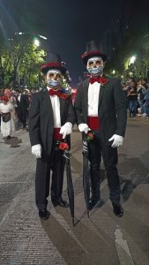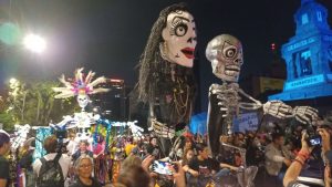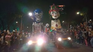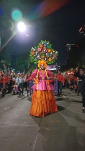 Catrinas deslumbrantes ataviadas con trajes brillantes y coloridos, mariachis, luchadores, adelitas, mujeres vestidas de novias y de la muerte, e incluso perritos Xoloitzcuintles disfrazados de calacas, todos acompañados por impresionantes esqueletos gigantes, desfilaban por la avenida al ritmo de tambores y música de carnaval. Los espectadores les vitoreaban, aplaudían y se sumían en la emoción del momento.