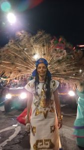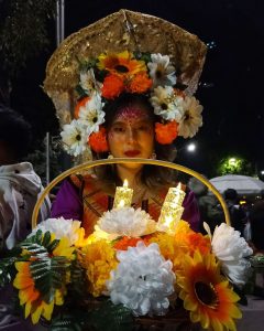 Ericka Corone, miembro del grupo "Tú eres Tepo y yo también," destacó como "La Llorona Azteca", luciendo un traje elaborado en tonos dorados y adornado con plumas de avestruz. Esta no era la primera vez que participaba en un desfile del Día de Muertos. Ericka compartió su entusiasmo por ser parte de estos eventos y destacó la importancia de mantener viva esta tradición.