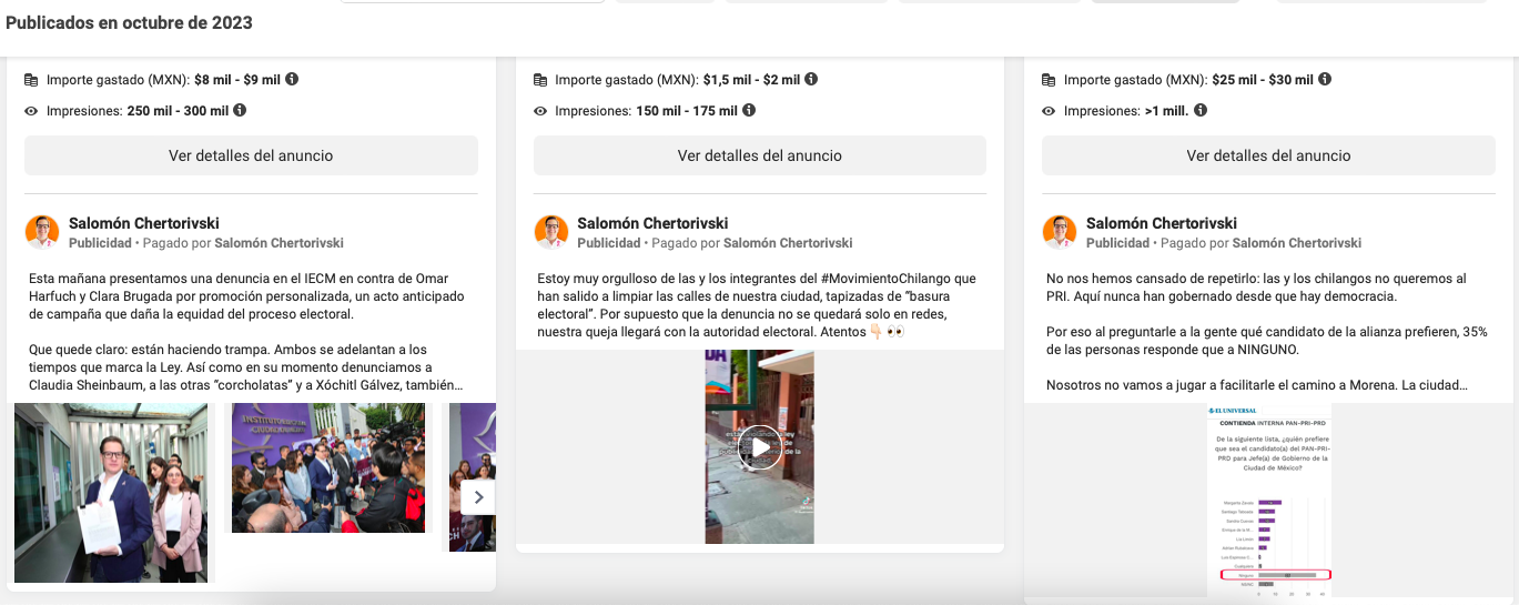 En tanto, el emecista Salomón Chertorivski ha gastado alrededor de 801 mil 021 pesos en 79 anuncios a lo largo de 2023, siendo que dos de ellos hacen referencia a la "basura electoral", o propaganda, colocada en muros y postes de la Ciudad de México con los rostros de Harfuch y Brugada. Casi una tercera parte de sus anuncios pagados están fechados de agosto en adelante.