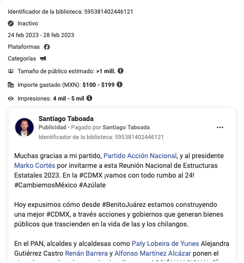 En el caso del panista Taboada, se promueve su imagen junto con la leyenda "Se siente el cambio" y el logotipo de la Alcaldía Benito Juárez. Sin embargo, la demarcación no tiene registrado gastos en publicidad oficial como parte de sus obligaciones ante la Plataforma Nacional de Transparencia; y al ser cuestionados por SinEmbargo sobre este gasto, no dieron respuesta al momento de esta publicación.