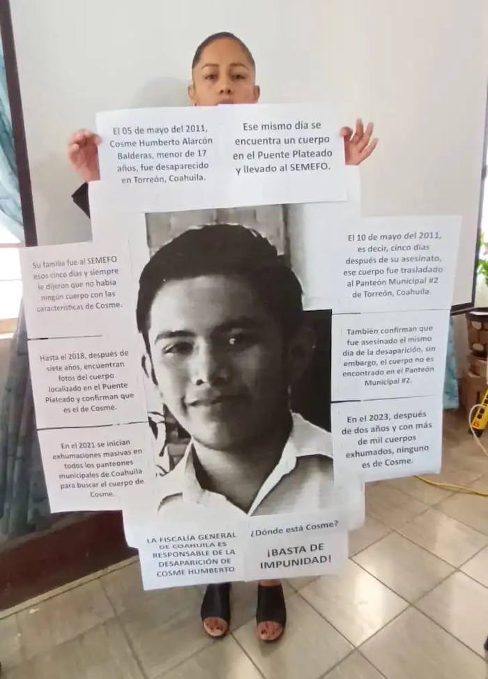 Cosme Humberto Alarcón Balderas, de 16 años, trabajaba como empacador en un City Club cercano a la carretera Torreón-Matamoros. Había quedado en encontrarse con su mamá y sus dos hermanos menores, Leonardo y María Luisa, al terminar la jornada de aquel 5 de mayo, pero nunca llegó a la cita.