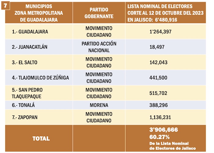Cinco de los siete municipios que integran la zona metropoliatana de Jalisco son gobernados por Movimiento Ciudadano (MC), uno por el Partido Acción Nacional (PAN) y otro por Morena, lo que sin duda le da al partido naranja una enorme ventaja rumbo a los comicios del próximo año.