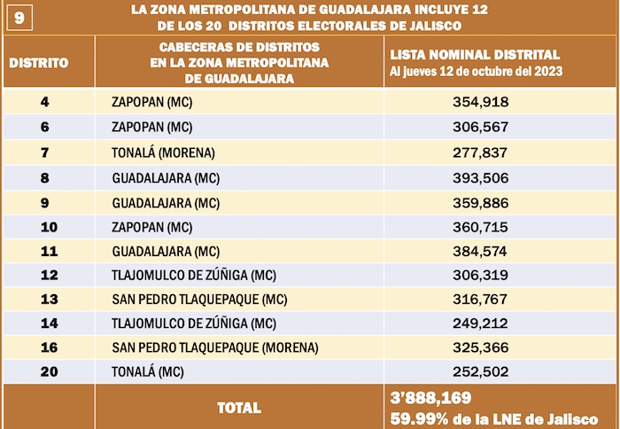 Del mismo modo, en la zona metropolitana de Guadalajara están concentrados el 60 por ciento de los potenciales votantes de todo Jalisco, en la conurbación que forman Guadalajara, Zapopan, Tlajomulco, Tlaquepaque, Tonalá, El Salto y Juanacatlán.
