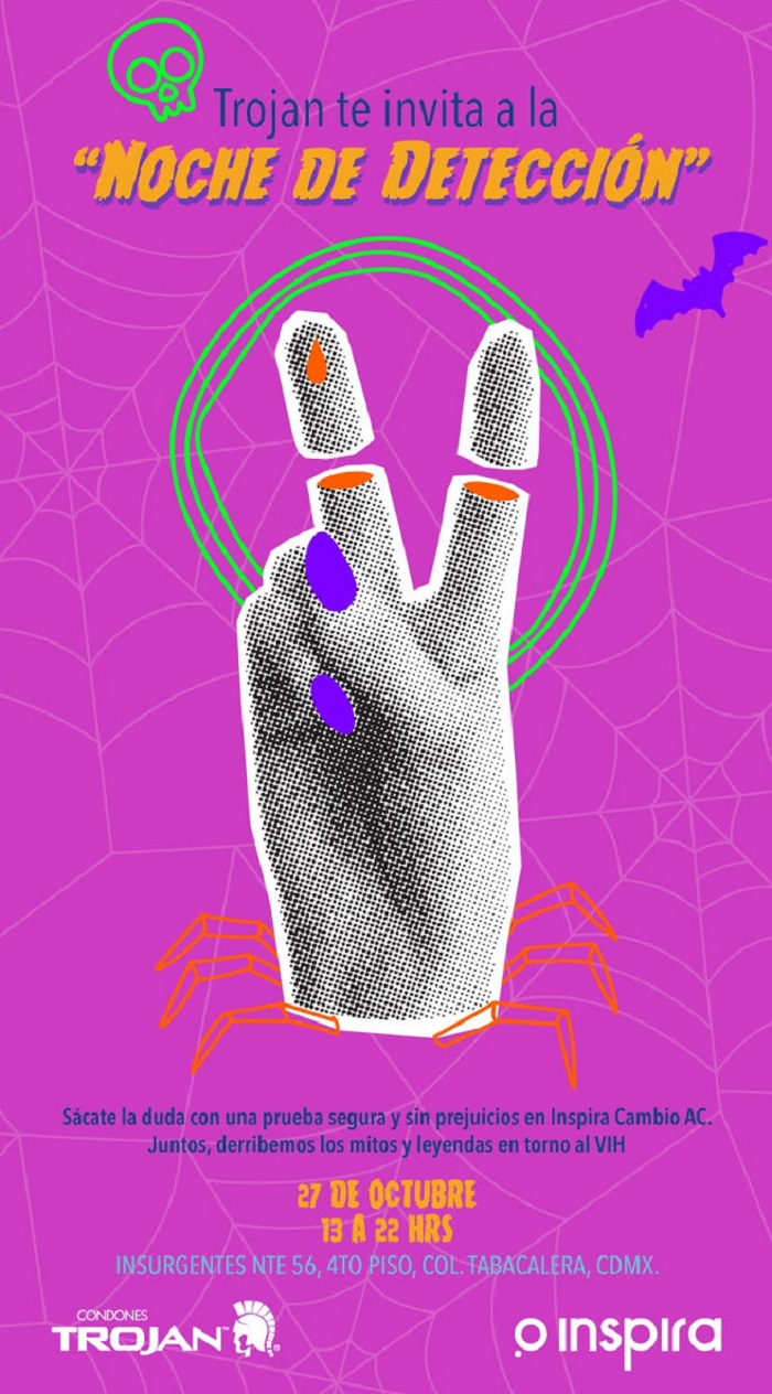 Trojan realizará pruebas gratuitas de VIH este viernes 27 de octubre de las 13:00 a las 16:00 horas en Insurgentes Centro #56, 4to piso, Col. Tabacalera, Cuauhtémoc, Ciudad de México. La "Noche de detección: Mitos y Leyendas", organizada por Trojan e Inspira Cambio AC., tendrá pruebas de detección de VIH confidenciales y gratuitas, oportunidades para aprender más sobre el VIH y desmitificar creencias erróneas y apoyo de expertos en salud sexual y activistas; sólo hay que realizar el pre-registro desde el Instagram de Trojan.
