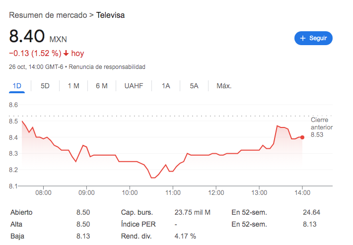 Ciudad de México, 26 de octubre (SinEmbargo).– Televisa, el mayor productor de contenidos audiovisuales de habla hispana a nivel mundial y cuyos títulos se desplomaron la semana pasada, reportó este jueves pérdidas por 918.5 millones de pesos durante el tercer trimestre del año afectado por la caída en sus unidades de cable y satélite.